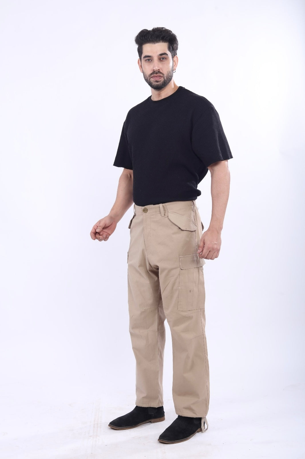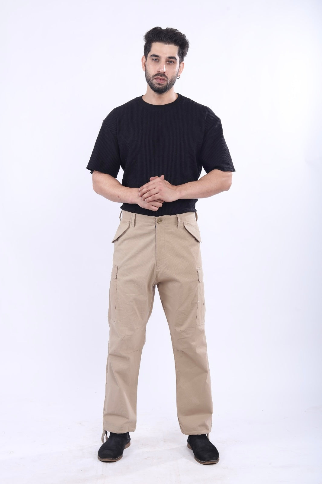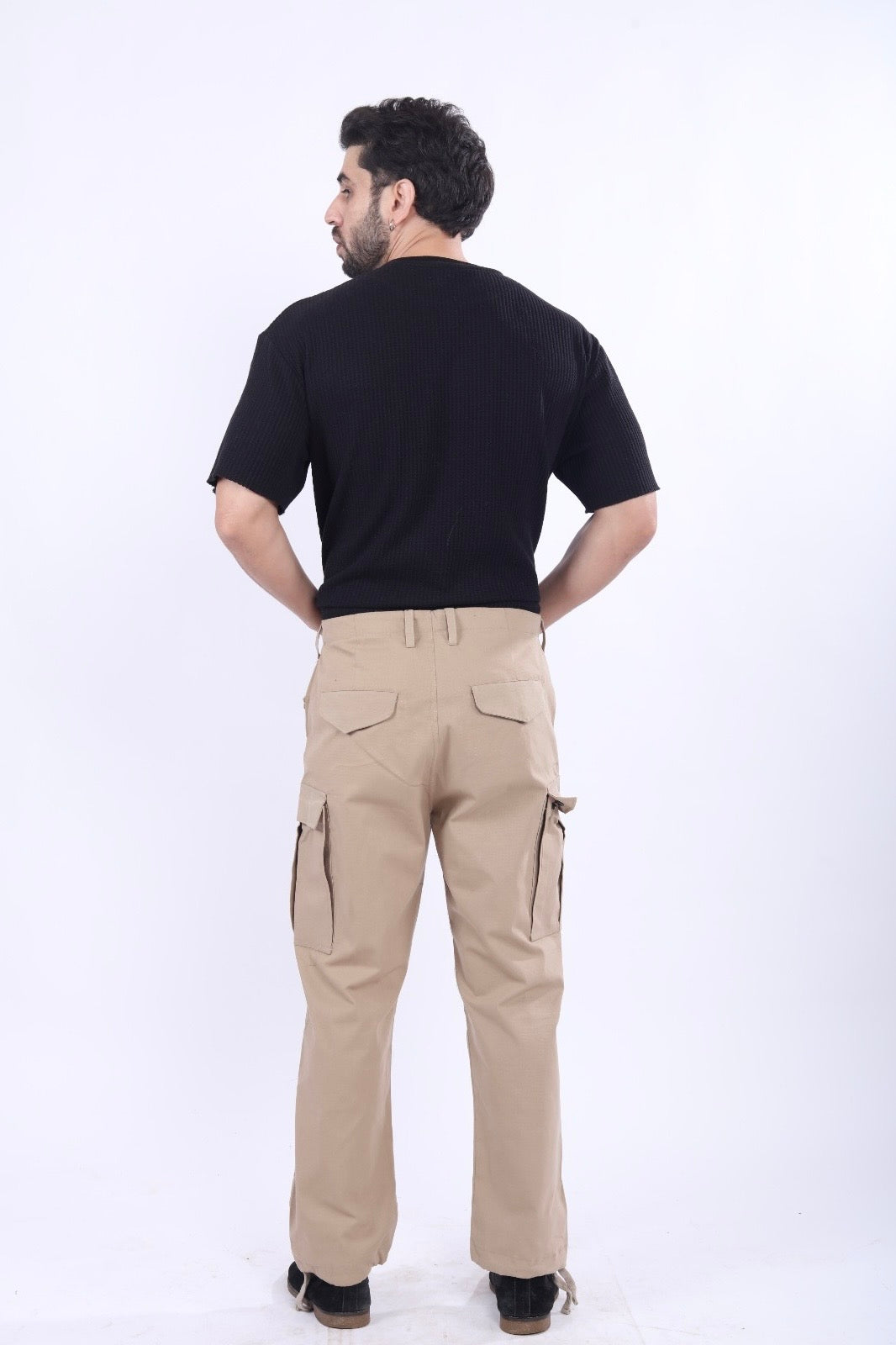 “Offering the same high-quality craftsmanship as our black cargos, these beige cargo pants are made from 100% pure cotton fabric for a soft, breathable fit. Featuring six spacious pockets—four in the front and two at the back —these cargos are both practical and stylish, making them a versatile addition to any wardrobe.”