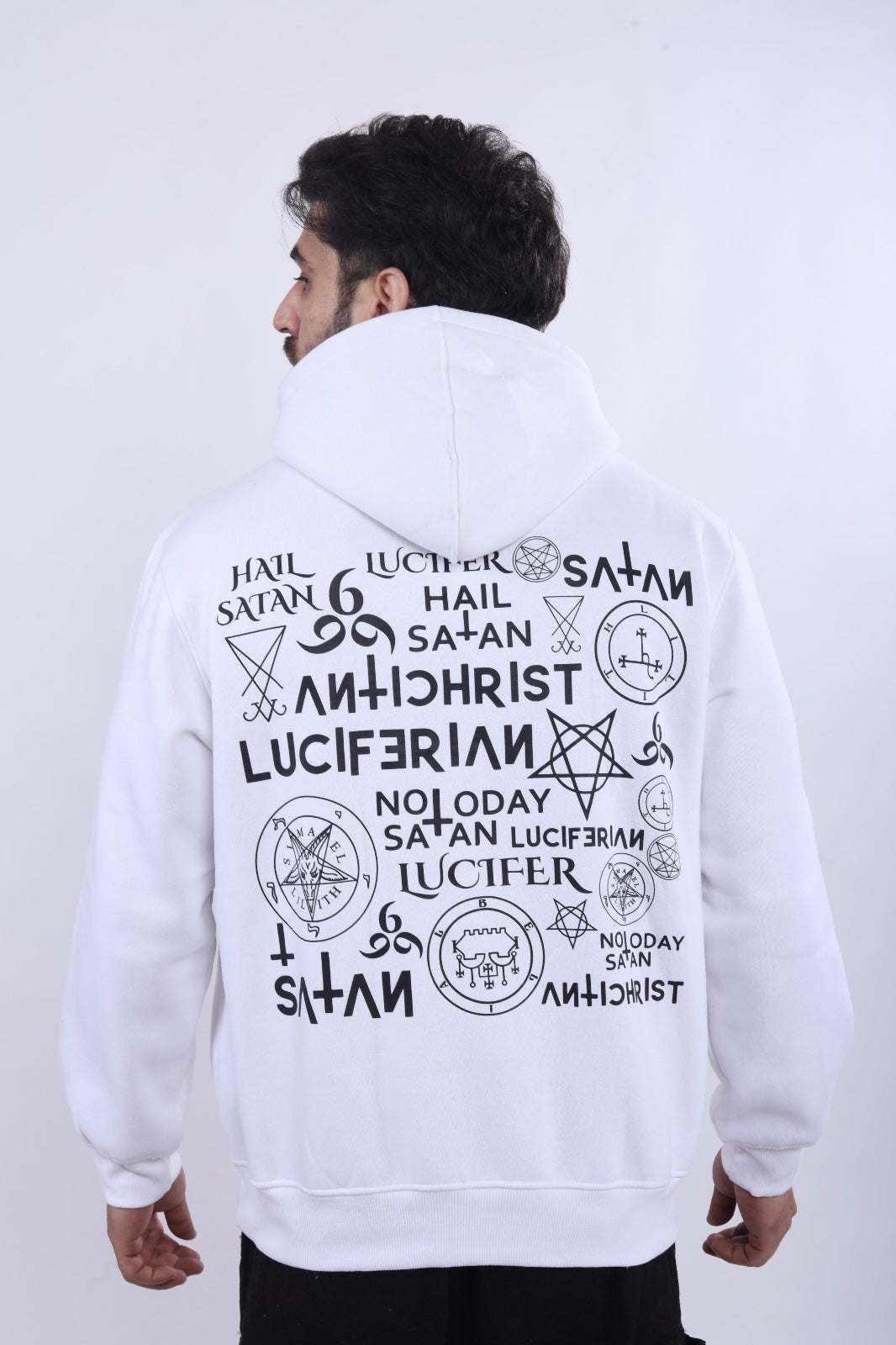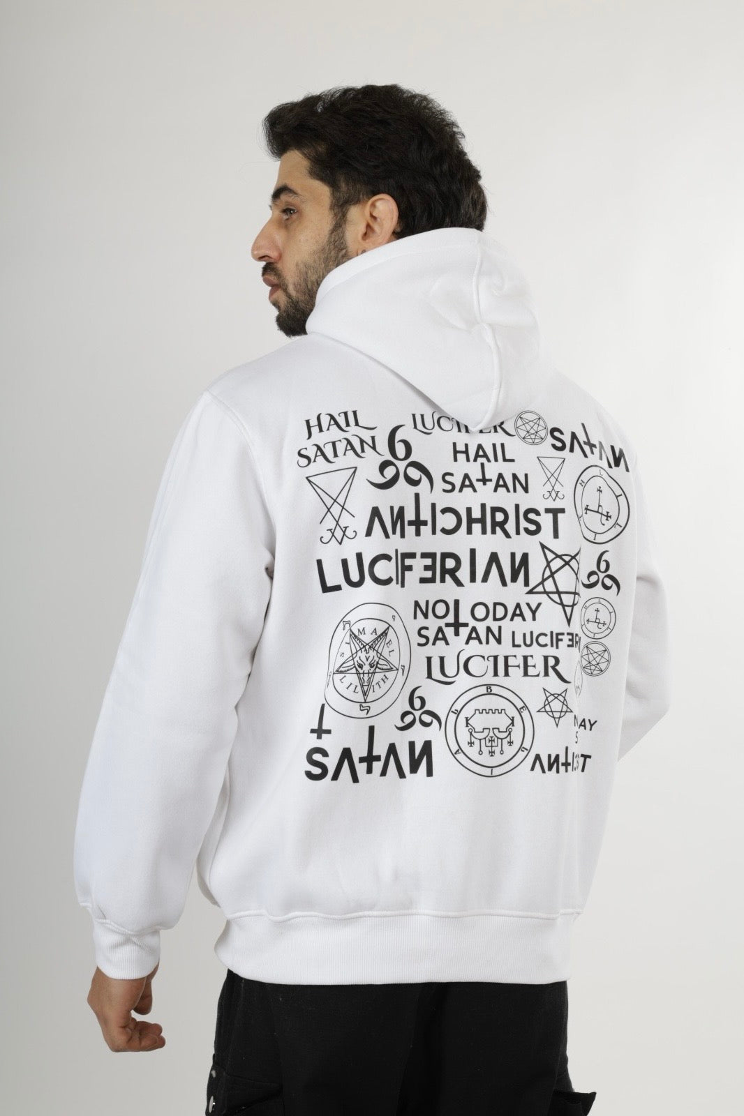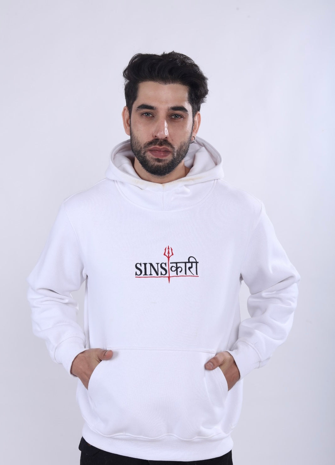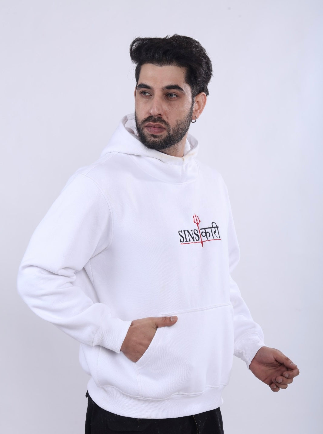 “Turn heads with this standout hoodie in pristine white. Made from soft 380 GSM cotton terry fabric, it features the signature SINSKARI brand logo on the front and an edgy, artistic back print, blending simplicity and boldness seamlessly.”
